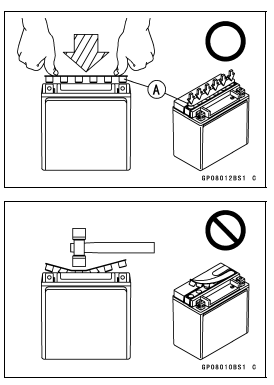 - Place the strip of caps [A] loosely over the filler ports, press down firmly with both hands to seat the strip of caps into the battery (don't pound or hammer). When properly installed, the strip of caps will be level with the top of the battery.