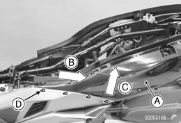 Front Center Cover Removal Remove: Windshield (see Windshield Removal) Quick Rivets [A] Pull the front center cover [B] forward [C] to clear the hooks [D] and remove the front center cover.